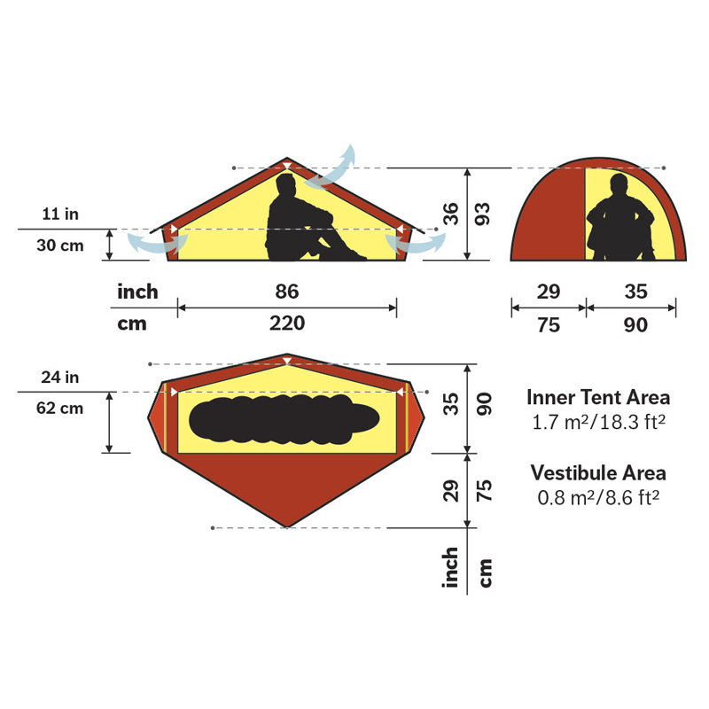 The Akto's design offers full sitting height in the middle of the tent, while sturdy fibreglass rods in the corners of the outer tent provide extra height, eliminating the claustrophobia that many solo tents engender. Tall users find it one of the few solo tents available that has enough room. The Akto's roomy configuration will easily accommodate both you and your gear.